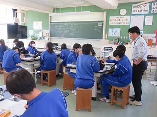 1B家庭科、調理実習、豚の生姜焼きです。最初に豚肉を強火と弱火でそれぞれ焼き、食感などを試したあと、豚の生姜焼きを作ります。給食前の一番お腹がすいている時間、上のフロアまでおいしそうな匂いがただよっていました。