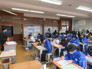 3Bの授業参観は、英語です。現在完了を学びます。日本語には現在完了的な使い方はないので、過去形とごっちゃにならないように注意です。日本で行ったことがある場所を3つ英語で、それぞれ書いていました。北海道、沖縄、大阪、東京などが目立ちました。そういえば、小学校の修学旅行で行った神奈川や栃木を書いている人は少なかったですね。